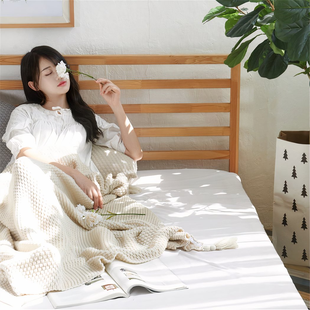 Sa texture unique au toucher, laisse apparaître un sentiment de confort des plus raffinés pour passer des moments de détente chauds et confortables à toute heure de la journée. Son design délicat est complété par des pompons aux quatre coins pour une touche de charme supplémentaire. Une couverture cosy et douillette, idéale pour vous envelopper de chaleur.
