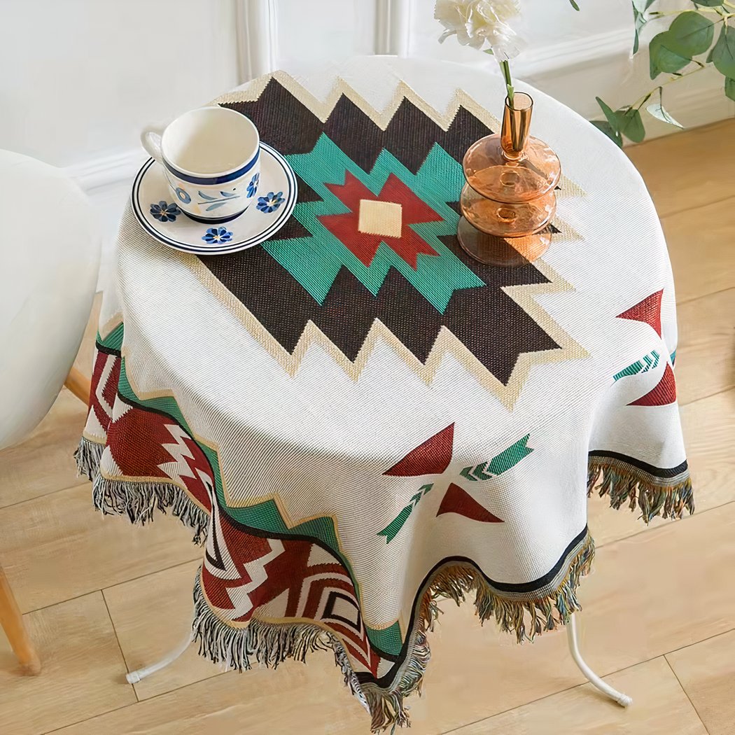 Le tissage de cette couverture forme des symboles traditionnels mexicains, de formes géométriques, vert et rouge sur un fond blanc avec des franges aux extrémités. Son allure bohème créera une atmosphère chaleureuse dans votre intérieur et se mariera avec différents styles de déco en faisant voyager votre intérieur vers des contrées lointaine, avec un esprit de liberté.
